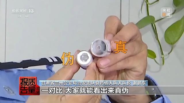 甘肃省兰州公安局治安支队食药侦大队大队长 谢鹏东:现场查获了大量不同品牌的肉毒素,比如我手里拿的这个。你看这个就是假的,你看底部显示的是干粉状,如果真的,显示你看这是一圈的圆圈粘在底部,这是非常明显的。一对比,大家就能看出来真伪。