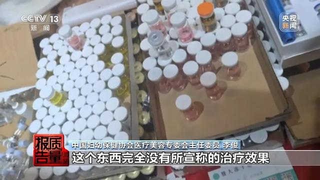 中国妇幼保健协会医疗美容专委会主任委员 李俊:没有经过正规、合法的途径获得相应资质,这个东西完全没有所宣称的治疗效果。还有一种,他会自己去把几种东西配到一起,包装一个比较绚丽的名称去告诉病人,然后去打到病人身上去。这种东西,修复的医生就很难判断它是什么,怎么去处理了。