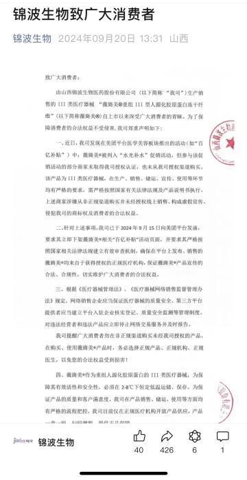 国庆节前,山西锦波生物发文呛声美团,称“美团平台医学美容板块推出的‘百亿补贴’活动中薇旖美被列入‘水光补水’促销活动,但参与该促销活动的部分商家未取得我司授权认证,也未从我司授权渠道购买。”