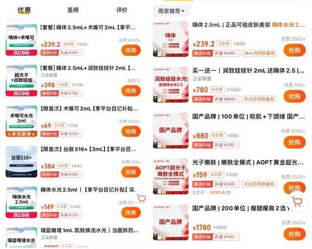 于是,医美下游的价格战愈演愈烈。在团购平台上,从几百元的水光针、到千元超声炮,甚至还出现了9.9元的组合打包价。