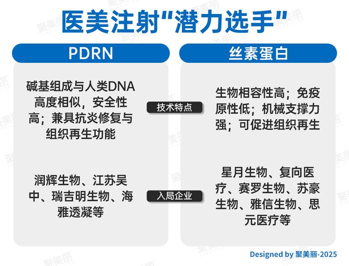 除了上述两款已经正式获批的产品外,已进入临床或上市申请阶段的PDRN复合溶液、拿到械Ⅱ证的丝素蛋白等新材料也在加速进场,开抢械Ⅲ首证。