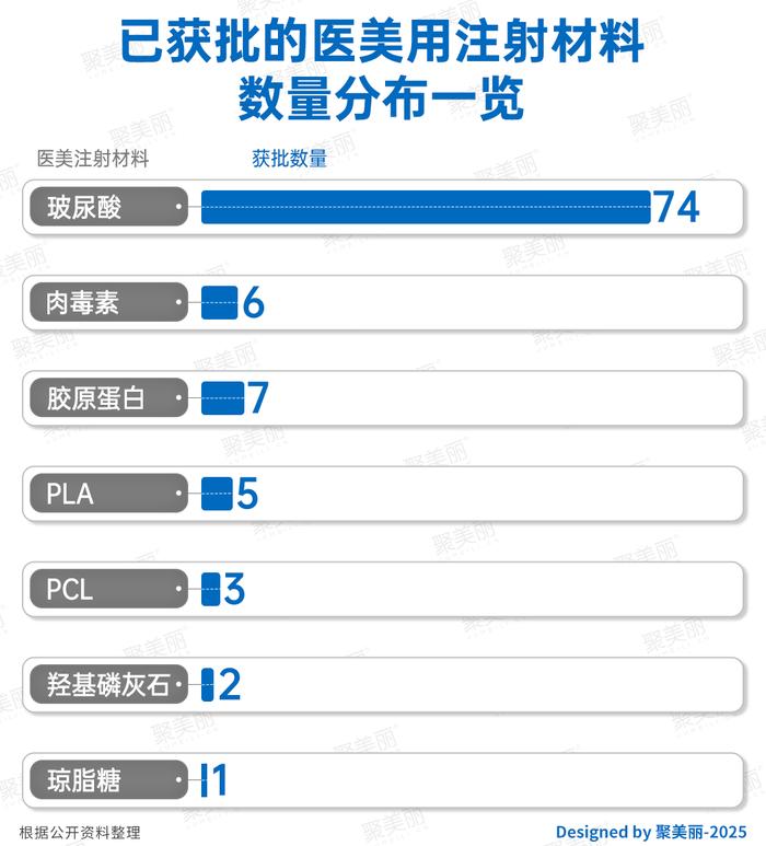 纵观国内医美市场,合规的医美用注射材料品类已达7种,包括玻尿酸、肉毒素、胶原蛋白三大传统品类,PLA、PCL两类再生材料,以及此次获批的羟基磷灰石和琼脂糖两款新材料。