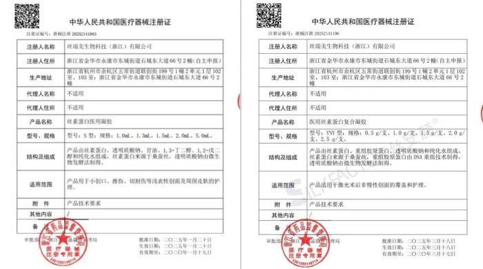 其中值得注意的是,近日,江苏吴中宣布PDRN复合溶液产品完成全部临床受试者入组,预计于下半年提交上市申请,2026年内有望获批,成为国内首个合规PDRN械Ⅲ产品 ;瑞吉明生物也于日前宣布旗下人工合成PDRN产品中式成功;而星月生物更是在今年连续获批两款丝素蛋白凝胶产品:星月生物旗下全资子公司——丝瑞美生物自主研发的“丝素蛋白医用凝胶”、“医用丝素蛋白复合凝胶”,分别于今年1月20日和3月18日获得浙江省药监局批准。