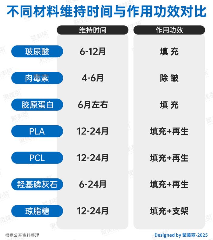 当下来看,尽管玻尿酸仍是主流,但其维持周期短和可能的水肿、移位问题多被诟病。而新材料的持久性,如羟基磷灰石效果可达1-2年,以及更自然的组织再生特性,更受当下消费者的青睐。