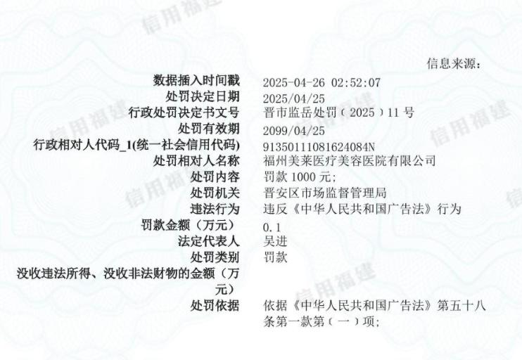 台海网4月29日讯 根据福州市晋安区市场监督管理局近日发布的行政处罚信息公开表(晋市监岳处罚〔2025〕11号)显示,因违反《中华人民共和国广告法》行为,对福州美莱医疗美容医院有限公司罚款1000元。
