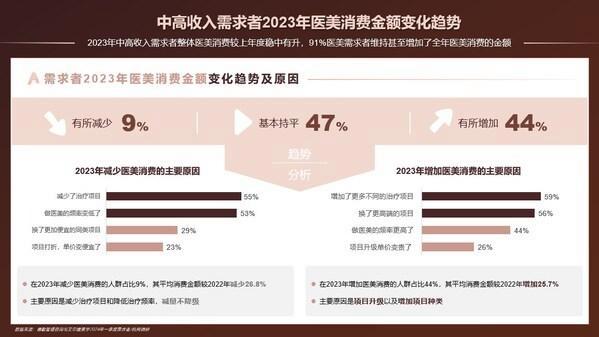洞悉报告数据显示,2023年,91%中高收入医美需求者的医美支出较上年稳中有升,增加的主要原因是项目升级或增加项目种类;展望2024年,绝大多数中高收入医美需求者将继续维持或增加医美消费金额,尤其青睐光电和注射类项目的持续消费。