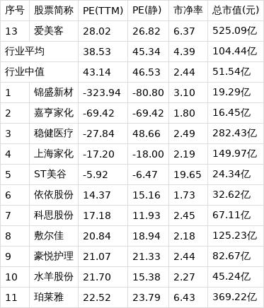 从行业市盈率排名来看,公司所处的美容护理行业市盈率平均38.53倍,行业中值43.14倍,爱美客排名第13位。