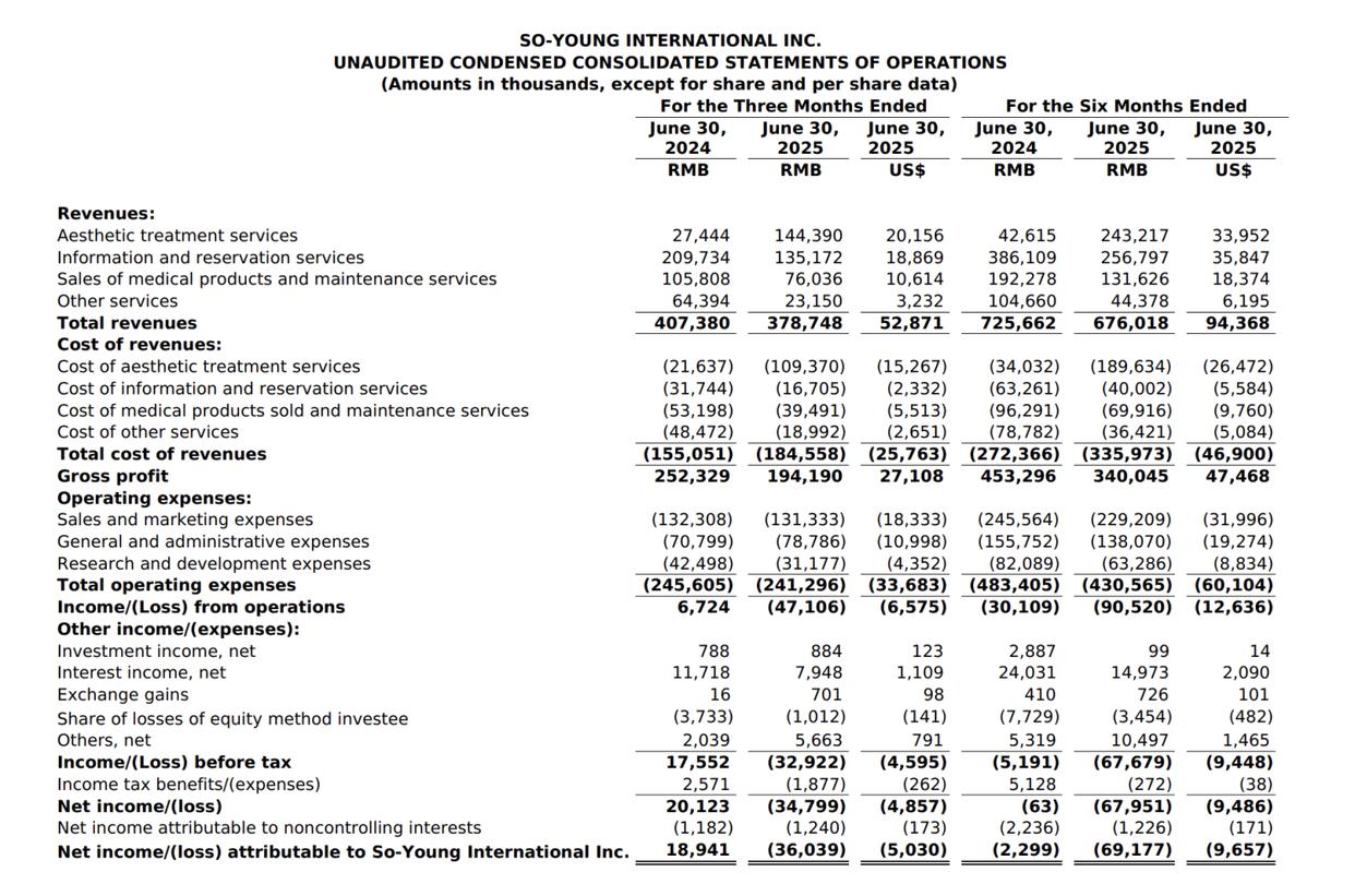 8月15日,医美与消费医疗服务平台新氧科技公布第二季度财报。财报显示,第二季度,新氧总营收为3.787亿元,2024年同期为4.074亿元,同比下滑7%;净亏损为3600万元,2024年同期为净利润1890万元;在非美国通用会计准则(Non-GAAP)下,新氧经调整后净亏损为3050万元,2024年同期为净利润2220万元。