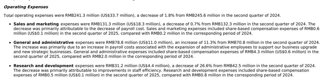 运营费用方面,新氧第二季度总运营费用为2.413亿元,较2024年第二季度的人民币2.456亿元下降1.8%。其中,研发费用为3120万元,较2024年第二季度的人民币4250万元下降26.6%。